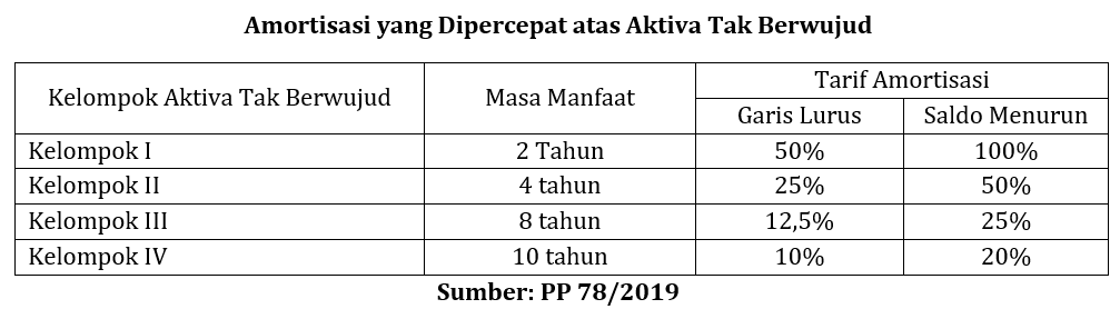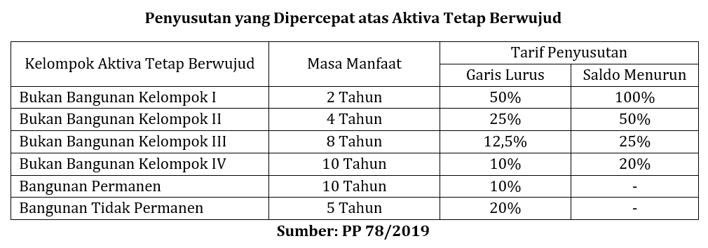 Kedua, penyusutan yang dipercepat atas aktiva tetap berwujud dan amortisasi yang dipercepat atas aktiva tak berwujud yang diperoleh dalam rangka penanaman modal. Adapun perincian masa manfaat dan tarif penyusutan atas aktiva tetap berwujud serta tarif amortisasi atas aktiva tak berwujud adalah sebagai berikut.
