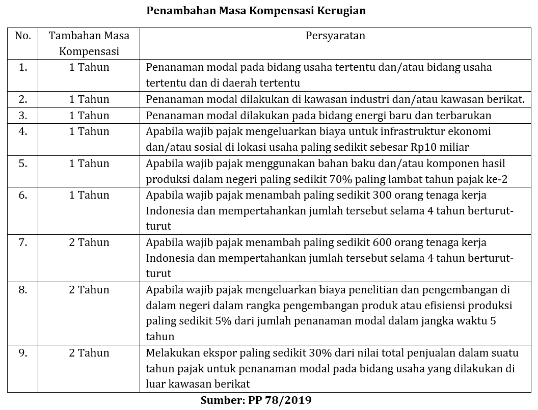 Wajib pajak dapat diberikan penambahan jangka waktu kompensasi kerugian lebih dari 5 tahun, tetapi tidak lebih dari 10 tahun. Penambahan masa kompensasi kerugian tersebut diberikan apabila wajib pajak memenuhi persyaratan tertentu. Adapun penambahan jangka waktu kompensasi kerugian beserta syaratnya diuraikan sebagai berikut.