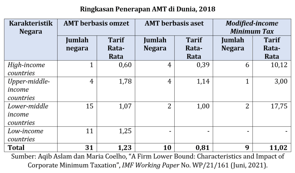 Secara umum, AMT diterapkan berbagai negara, baik berpenghasilan tinggi, menengah, maupun rendah. Adapun AMT yang berbasis pada omzet pada umumnya diterapkan negara berpenghasilan menengah ke bawah.