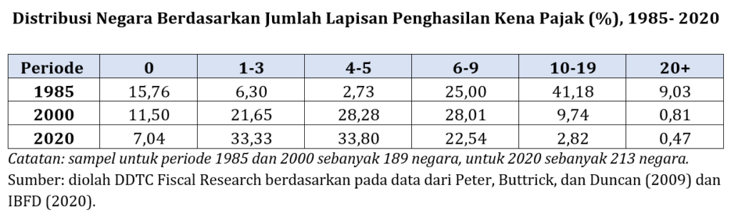 Tren ini relatif bertahan hingga kini. Pada 2020, distribusi tertinggi ada pada negara yang memiliki 4 hingga 5 tax bracket dalam struktur PPh orang pribadi.