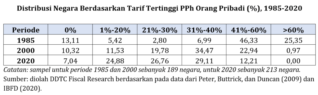 Hasilnya, negara yang mengenakan tarif tertinggi PPh orang pribadi di atas 40% berkurang secara drastis. Hal ini terlihat dari distribusi negaranya yang kian rendah dan justru beralih ke tarif lebih rendah dari 40%.