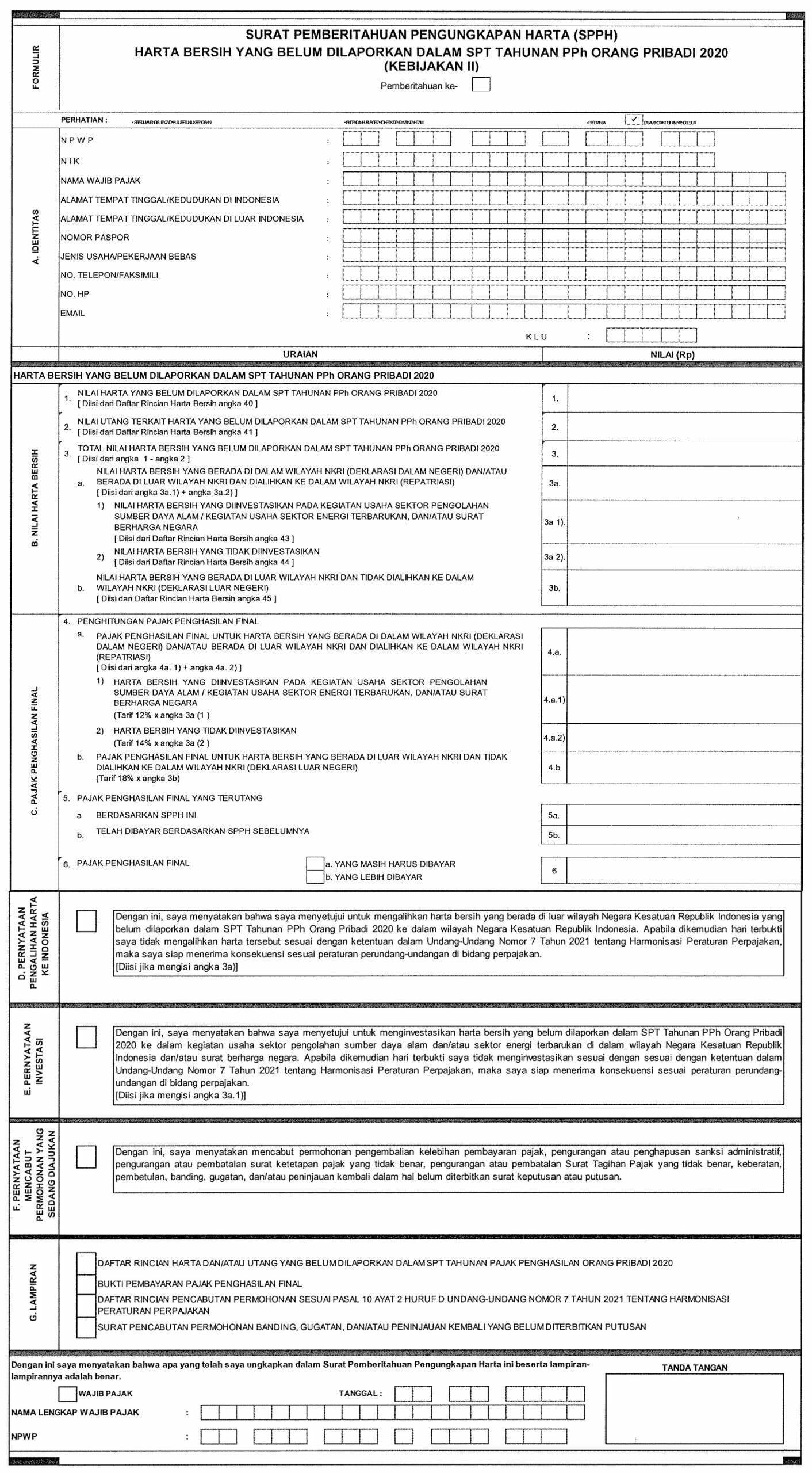 Adapun petunjuk pengisian formulir SPPH (kebijakan II) dapat dilihat pada lampiran tersebut. Untuk pertunjuk umum, berdasarkan ketentuan UU Harmonisasi Peraturan Perpajakan (HPP), ada hal-hal yang perlu diperhatikan wajib pajak.