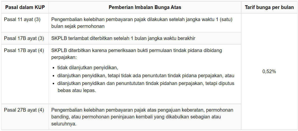 Sementara itu, tarif bunga per bulan sebagai dasar pemberian imbalan bunga ditetapkan 0,52%. Tarif tersebut lebih tinggi ketimbang tarif periode sebelumnya. Perincian tarif periode 1 Januari 2022 sampai dengan 31 Januari 2022 dapat dilihat pada tabel berikut.