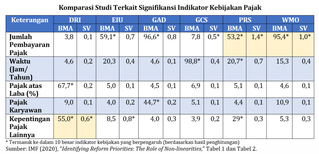 Meskipun menggunakan data yang relatif sama, terdapat perbedaan temuan dari masing-masing kajian tersebut. Apabila menggunakan BMA, masing-masing indikator kebijakan pajak dapat berperan penting dalam membangun iklim bisnis suatu negara/yurisdiksi tergantung dari pengukuran data indeks iklim bisnis yang dirilis oleh masing-masing instansi.