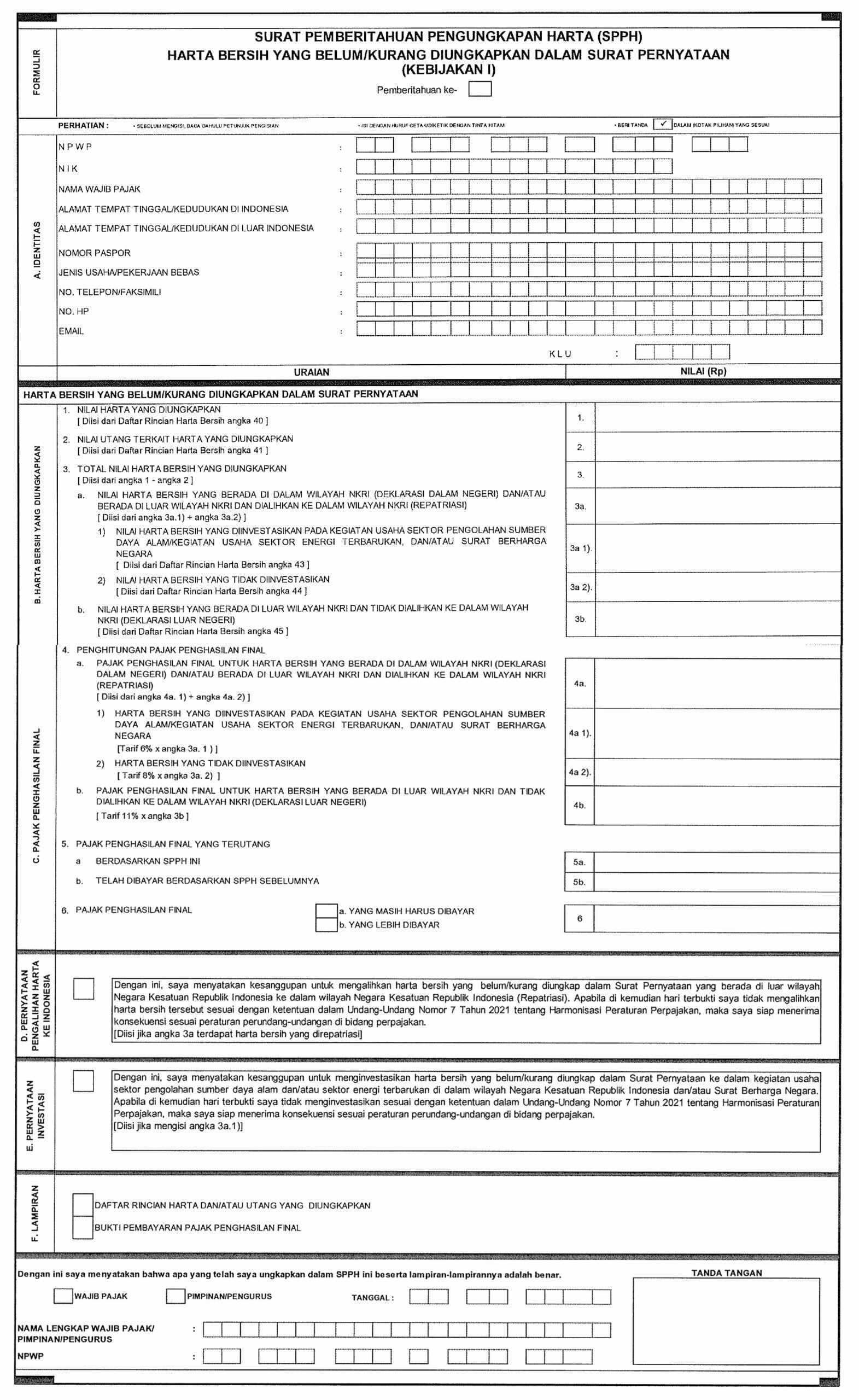 Adapun petunjuk pengisian formulir SPPH (kebijakan I) dapat dilihat pada lampiran tersebut. Untuk pertunjuk umum, berdasarkan ketentuan UU Harmonisasi Peraturan Perpajakan (HPP), ada hal-hal yang perlu diperhatikan wajib pajak.