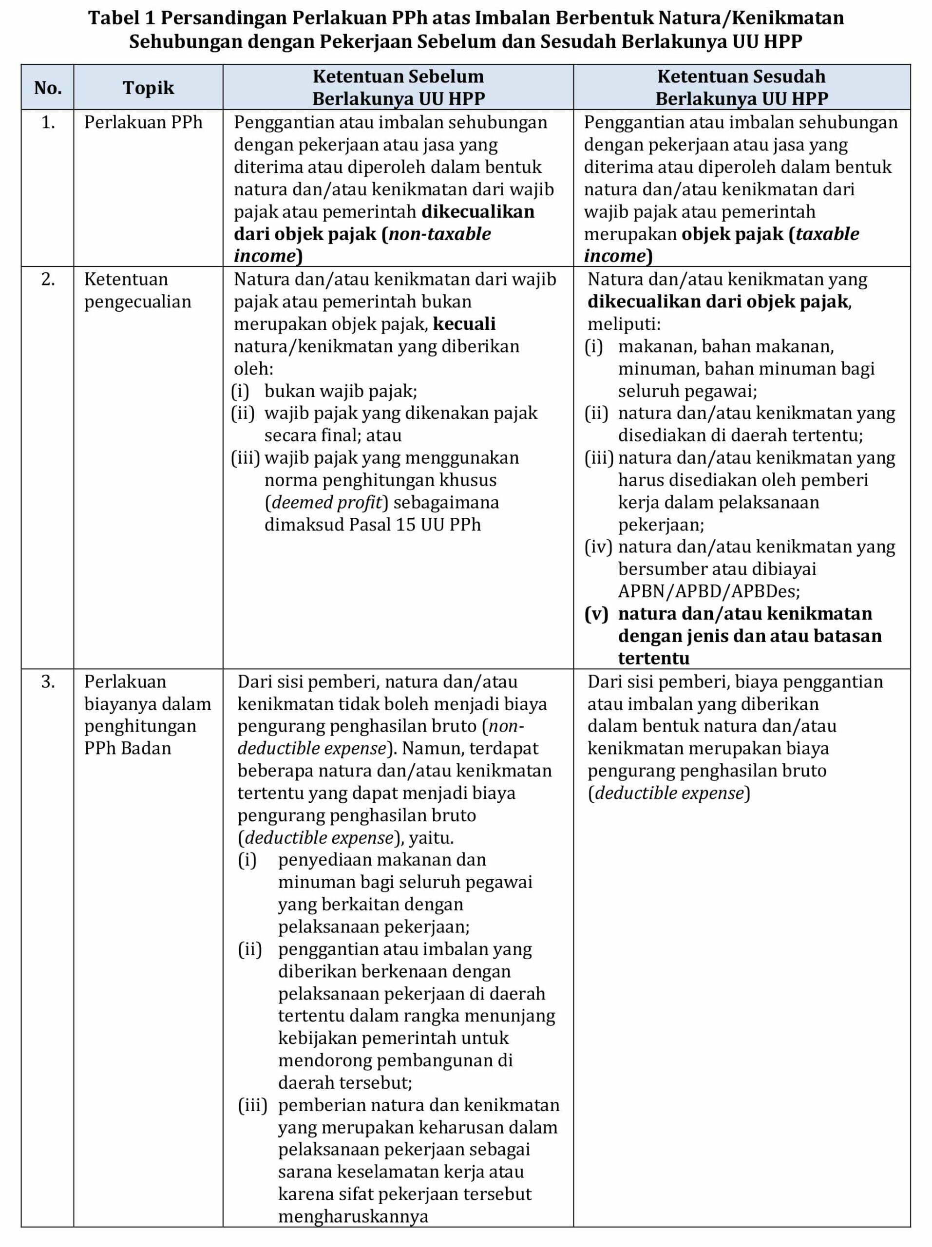 Sebelum pemaparan lebih lanjut mengenai perubahan yang dibawa UU HPP terkait dengan perlakuan PPh atas imbalan berbentuk natura atau kenikmatan tersebut beserta persoalan-persoalan yang mungkin terkandung di dalamnya, terlebih dahulu disajikan persandingan perlakuan PPh atas imbalan berbentuk natura/kenikmatan sehubungan dengan pekerjaan sebelum dan sesudah berlakunya UU HPP.