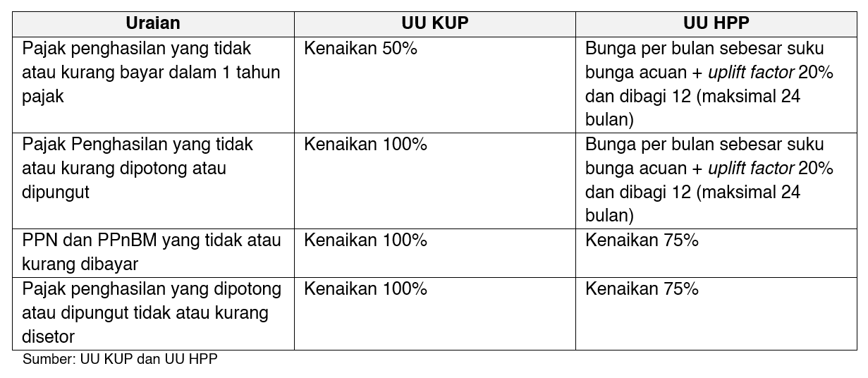 Sehubungan dengan perubahan sanksi ini, pemerintah juga menambahkan Pasal 13 ayat (3b) dan (3c) yang mengatur lebih lanjut perihal pengenaan sanksi bunga. Perbandingan sanksi dalam UU HPP dengan ketentuan terdahulu dapat disimak dalam tabel berikut.