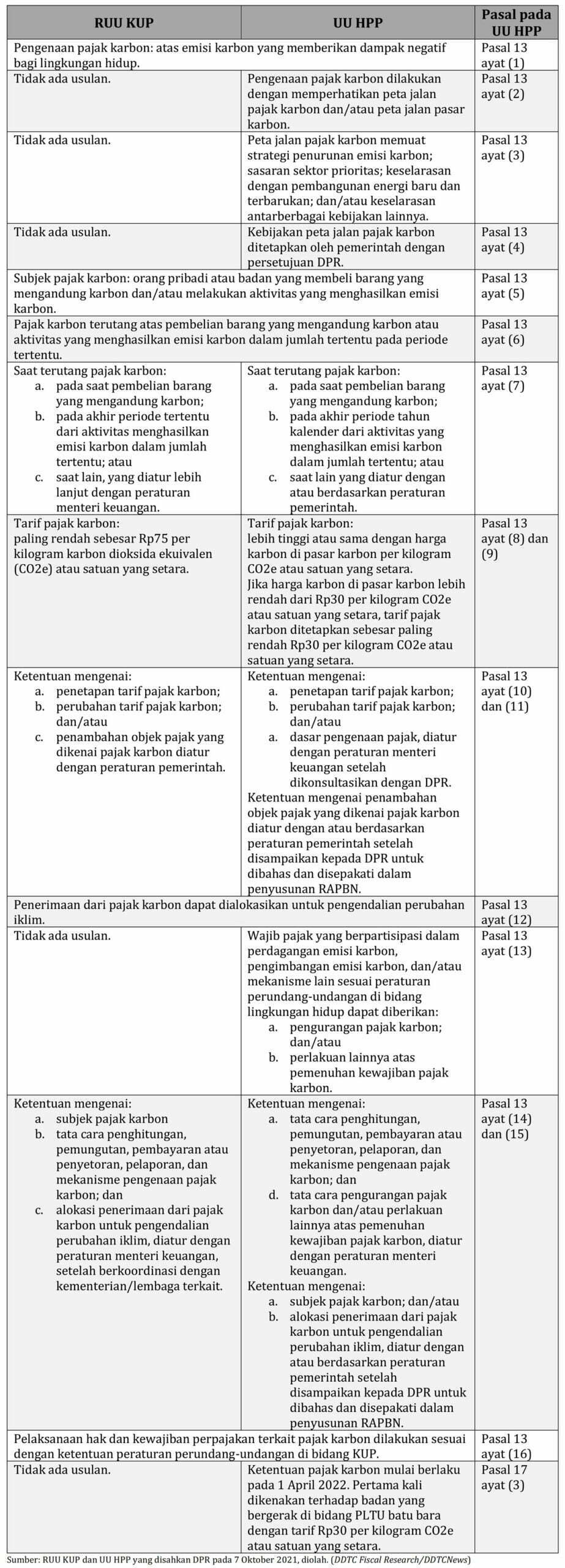 Simak tabel berikut ini untuk melihat ketentuan pajak karbon yang telah resmi masuk dalam UU HPP dibandingkan dengan usulan awal pemerintah dalam RUU KUP.